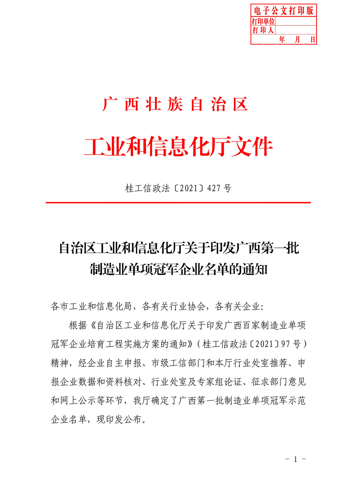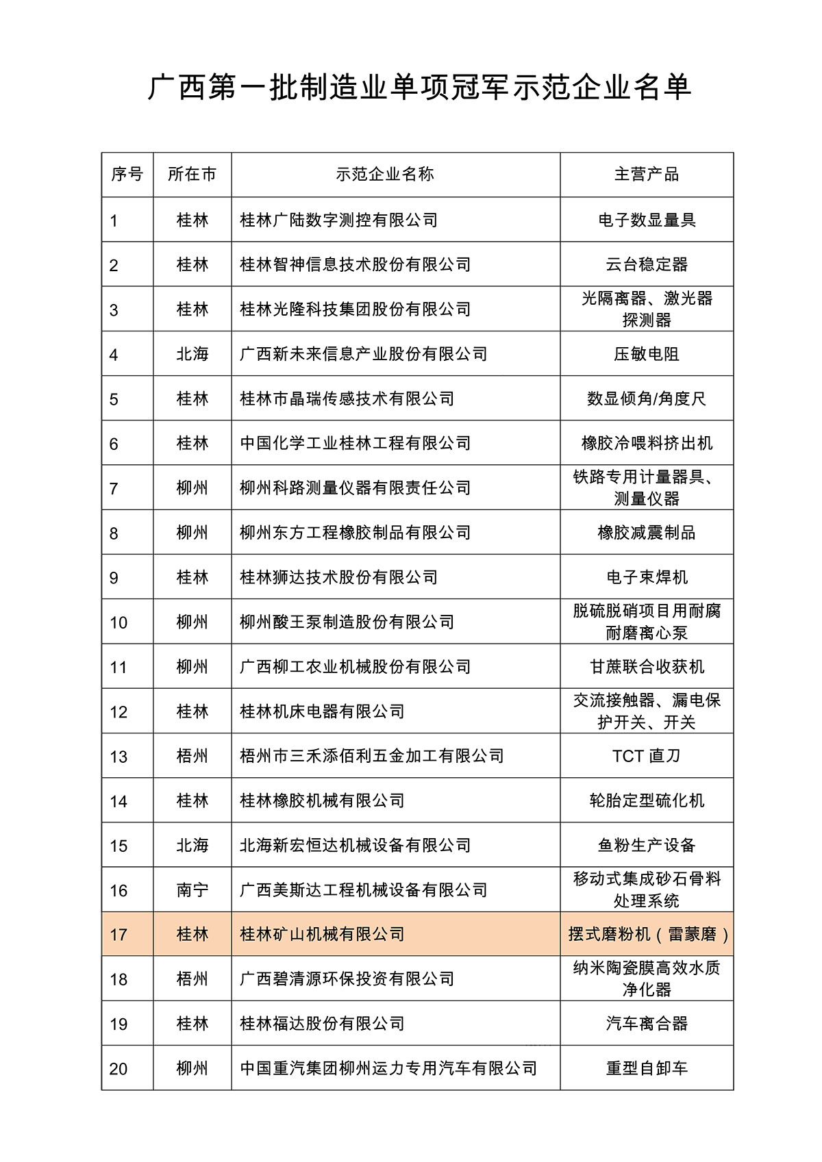 日前,自治區(qū)工業(yè)和信息化廳關(guān)于印發(fā)廣西第一批制造業(yè)單項(xiàng)冠軍企業(yè)名單的通知,確定了桂林礦機(jī)等42家企業(yè)成功入選廣西第一批制造業(yè)單項(xiàng)冠軍示范企業(yè)。