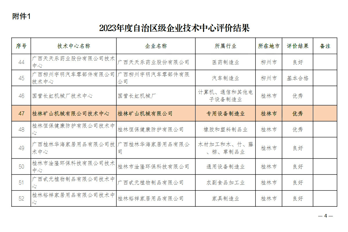 6月27日,自治區工業和信息化廳公布2023年自治區級企業技術中心評價結果的通知,根據《廣西壯族自治區認定企業技術中心管理辦法》(桂工信科技〔2018〕228號)有關規定,對2017年、2019年、2021年獲認定的自治區級企業技術中心組織開展了復核評價,符合此次評價年限的自治區級企業技術中心共有94家,其中89家提交了評價材料,5家企業技術中心因經營困難或者企業重組等原因申請暫緩評價。89家提交材料的企業技術中心評價結果:優秀(90分以上)27家、良好(65-90分)53家、基本合格(60-65分)9家。桂林礦山機械有限公司憑借在科技創新能力、新產品研發等方面較大的優勢,以優秀成績通過2023年復核評價。